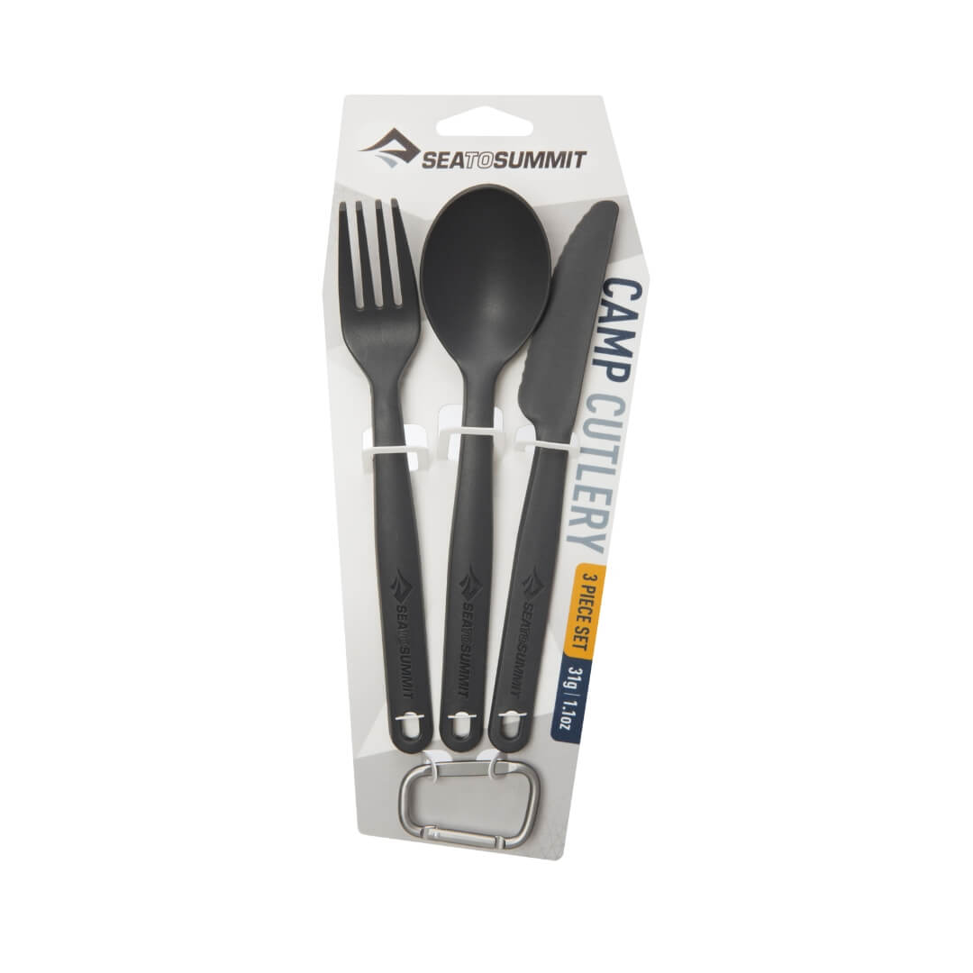 Camp Cutlery bestiksæt fra Sea to Summit er et bestiksæt med en gaffel, kniv og ske i holdbart, let glasforstærket BPA-fri polypropylen. Den medfølgende karabinhage kan bruges til at hænge eller klikke det tredelte sæt sammen.