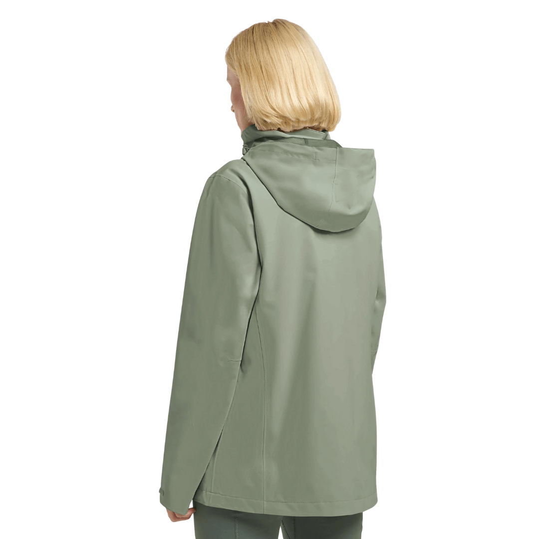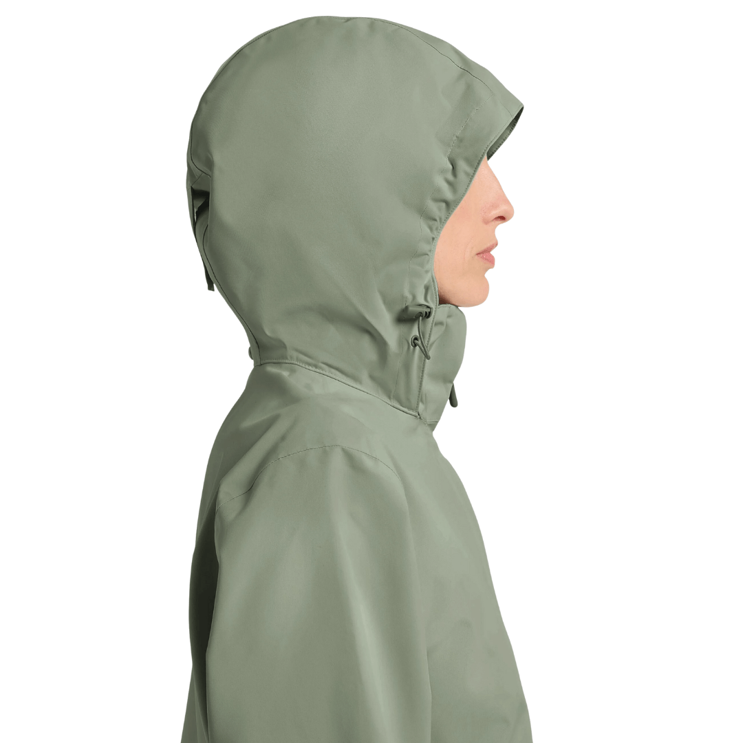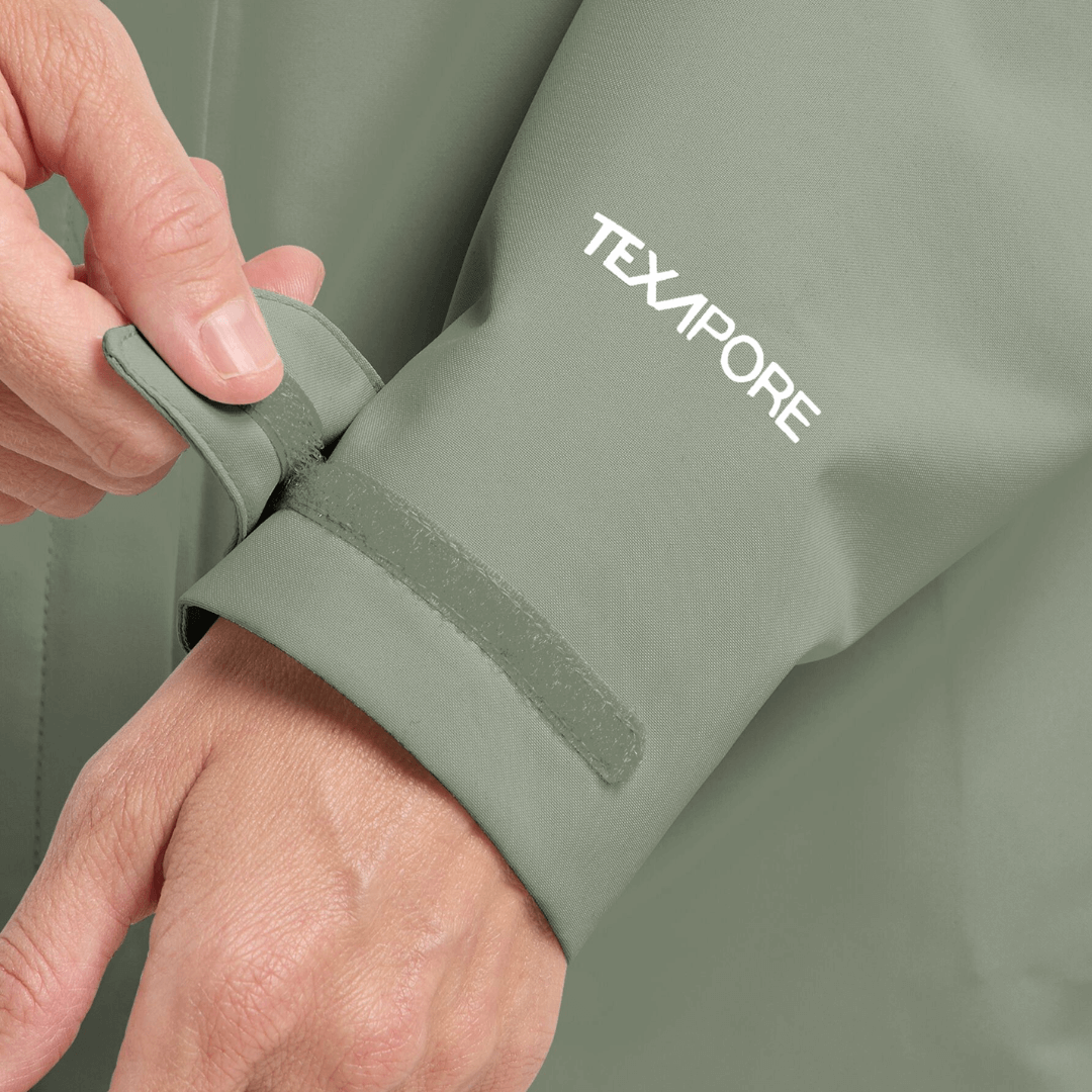 Vandtætte lynlåse, justerbar kant og en fast, justerbar hætte holder vind og fugt ude. På tørre dage kan hætten nemt gemmes væk i kraven.