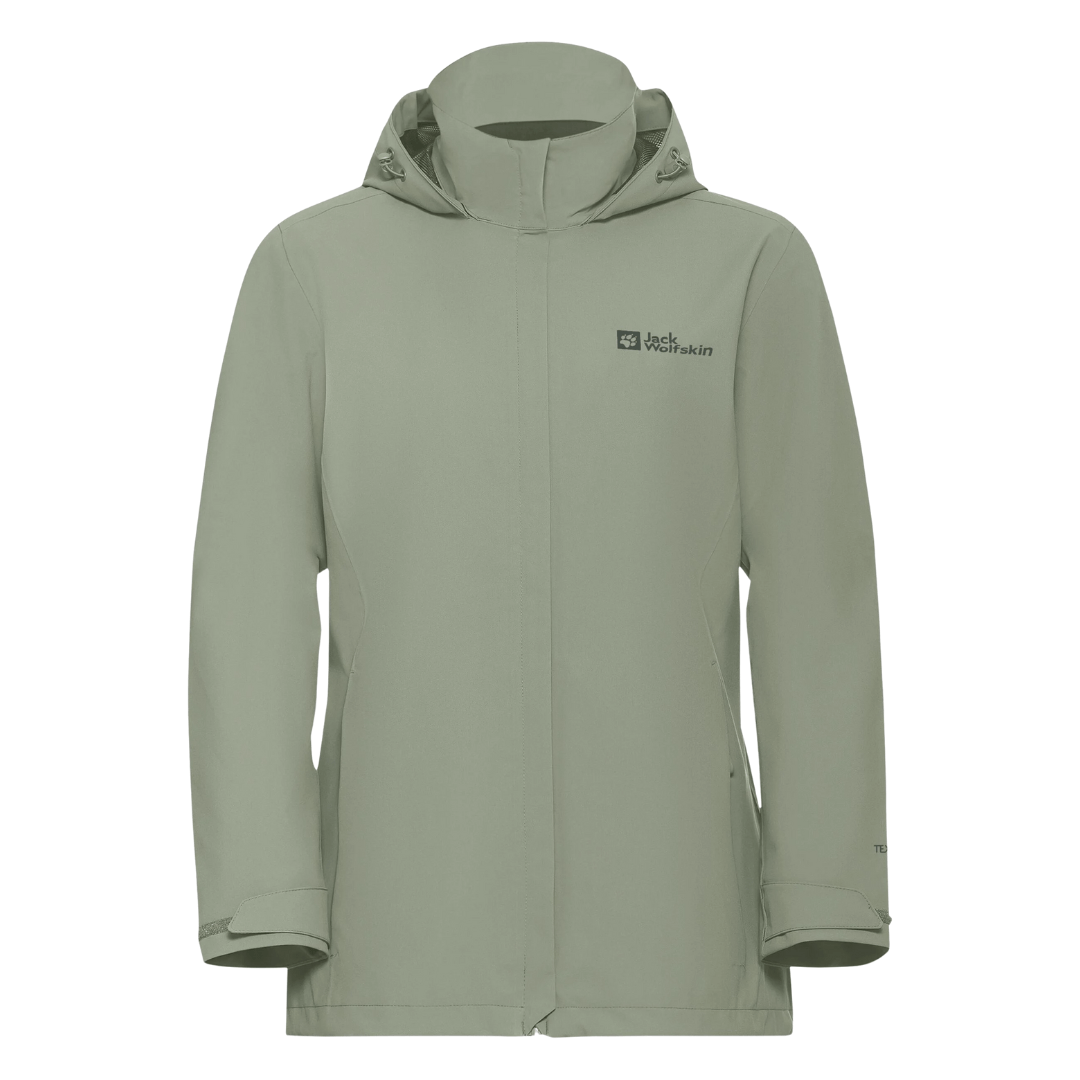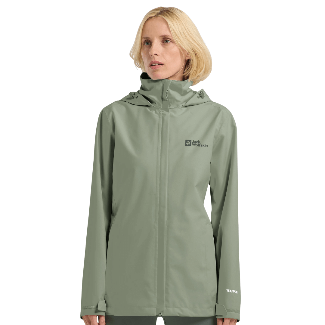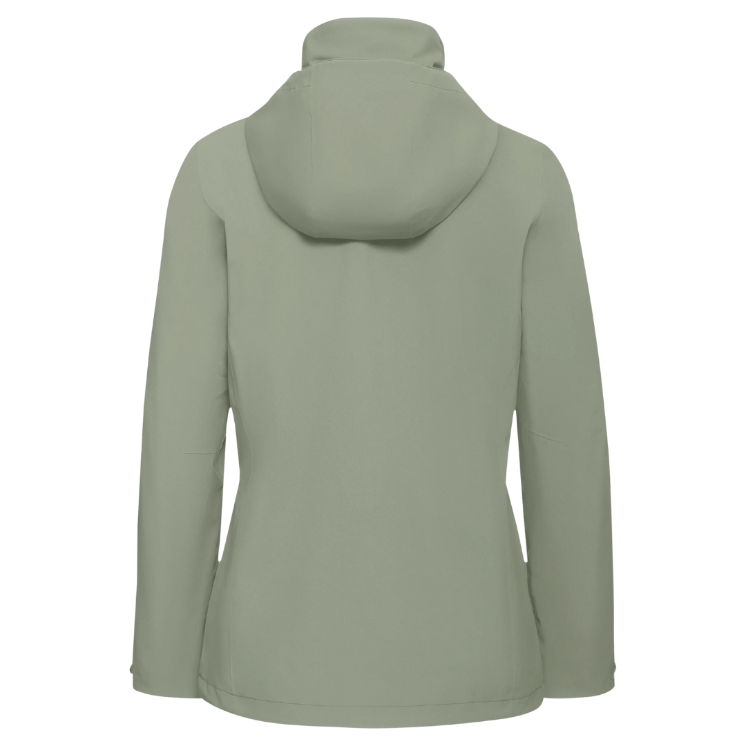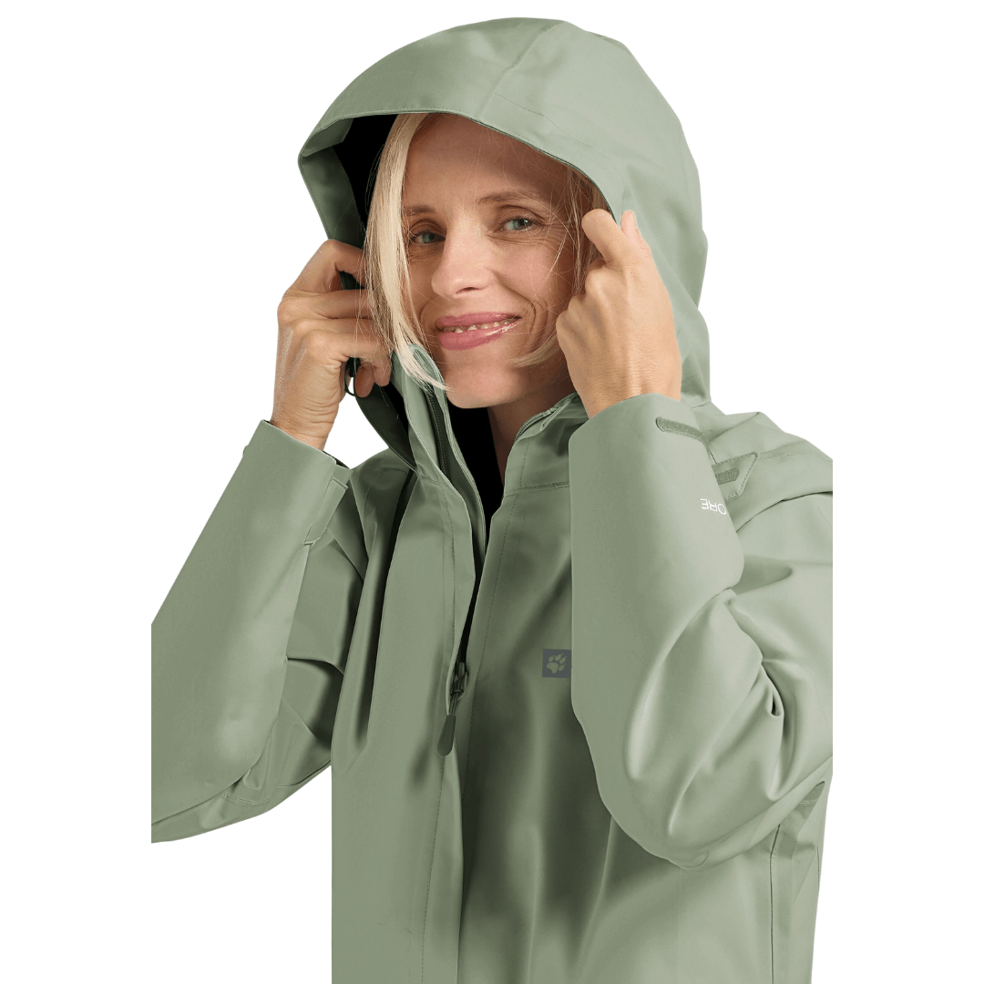 Vandtætte lynlåse, justerbar kant og en fast, justerbar hætte holder vind og fugt ude. På tørre dage kan hætten nemt gemmes væk i kraven.
