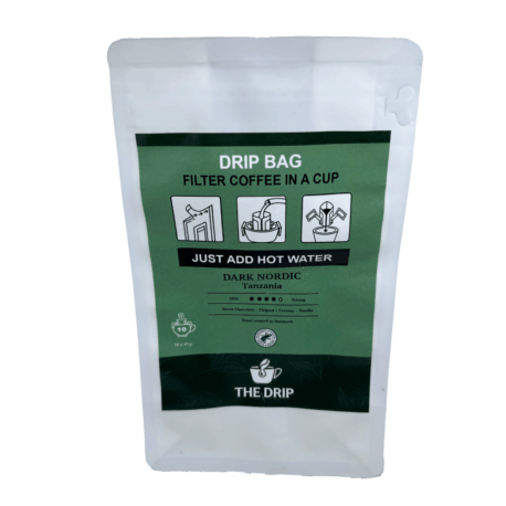 Denne 10-pak indeholder 10 stk. drip bags med dansk mellemristet kvalitetskaffe. 1. Riv toppen af filteret 2. Fold ørerne ud og sæt det fast på koppen 3. Hæld langsomt 200 ml varmt vand (90–95 °C) over kaffen 4. Lad den trække i 2–5 minutter 5. Fold ørerne og tag filteret op af koppen 6. Nyd – hvor som helst, når som helst