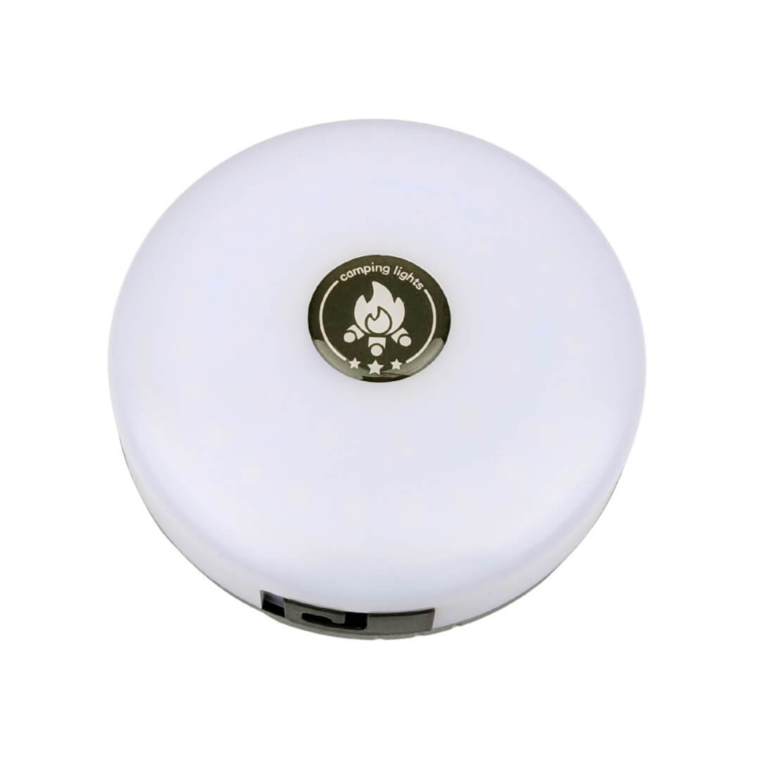 Lanternen oplades gennem det medfølgende USB-C kabel, så det nemt kan lades op med en powerbank, computer eller vægoplader. Det indbyggede 2000 mAh lithium-batteri giver pålidelig strøm. På bagsiden ses blå prikker der viser hvor meget strøm der er tilbage på lanternen og små magneter der gør det muligt at fastgøre lanternen til metaloverflader.