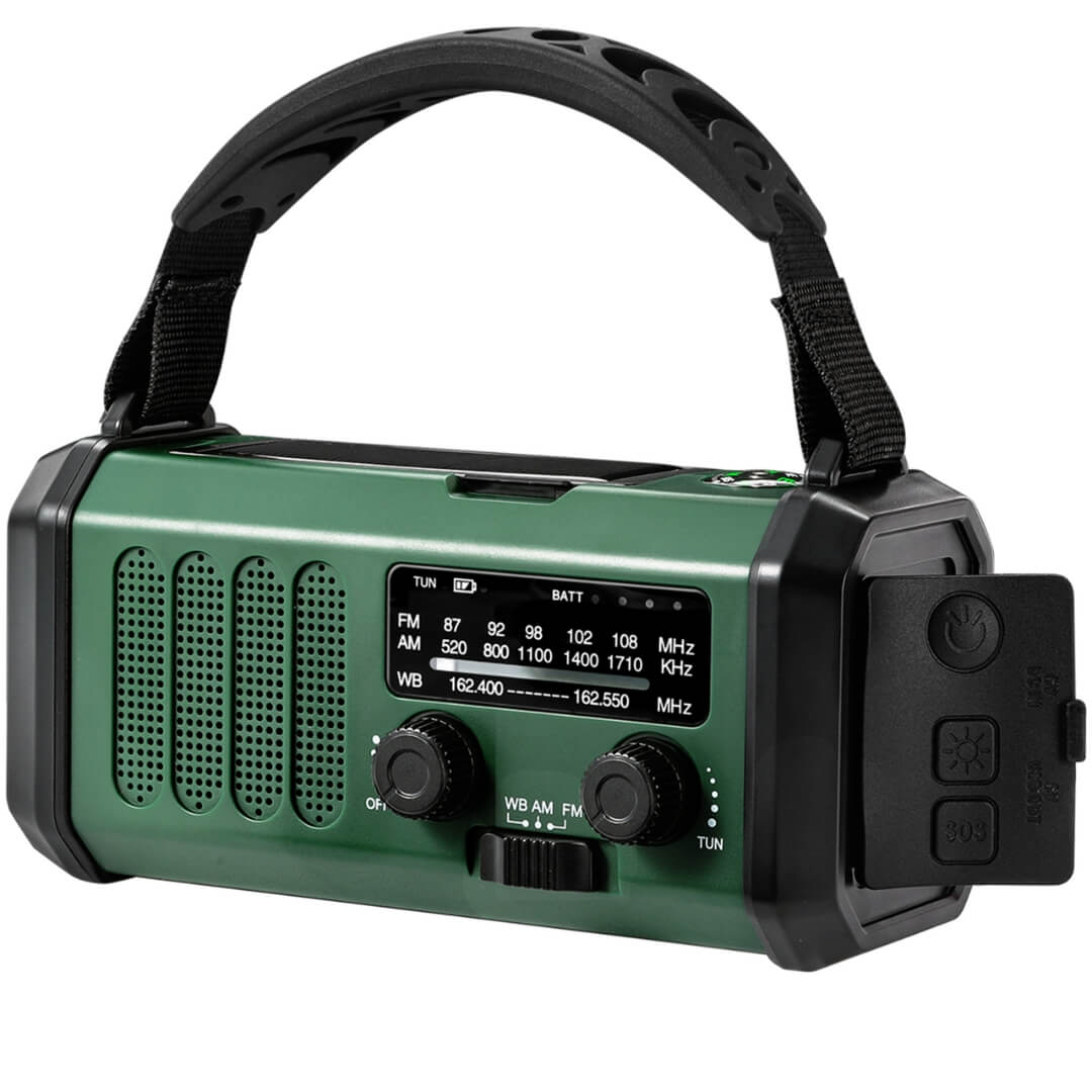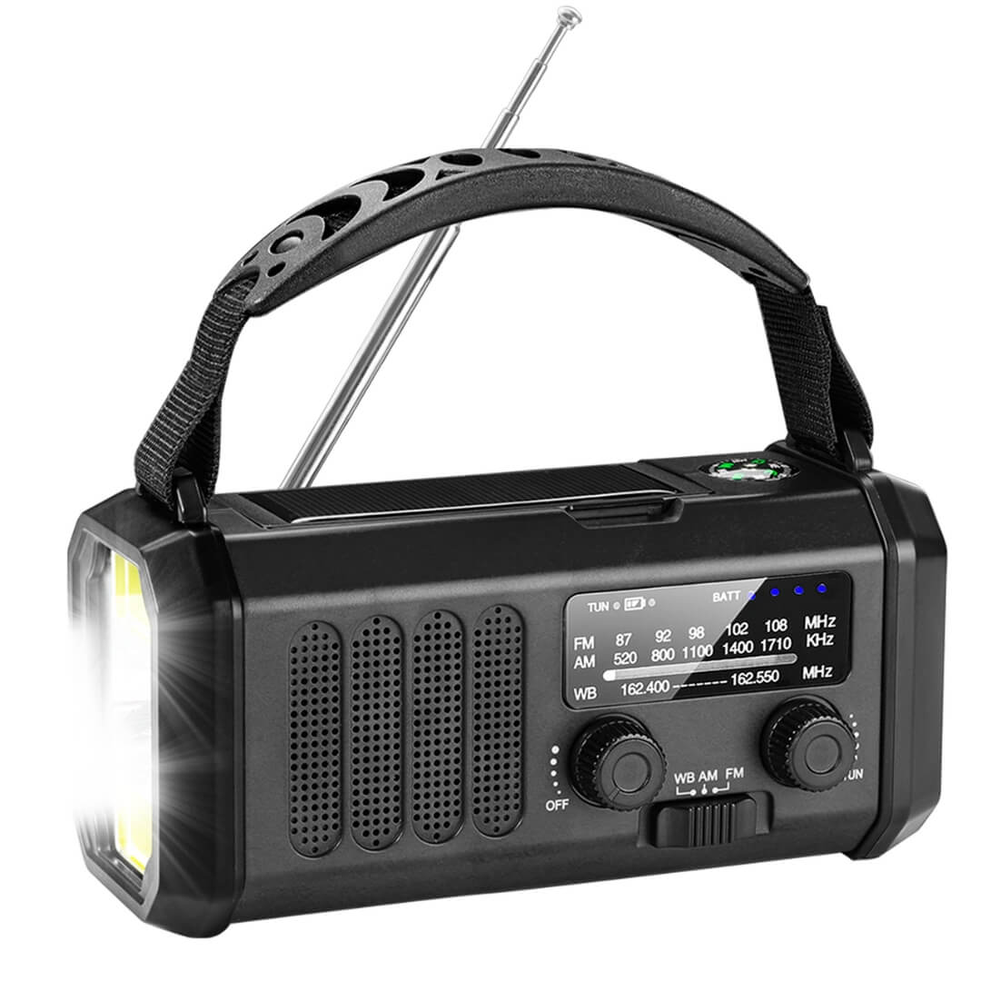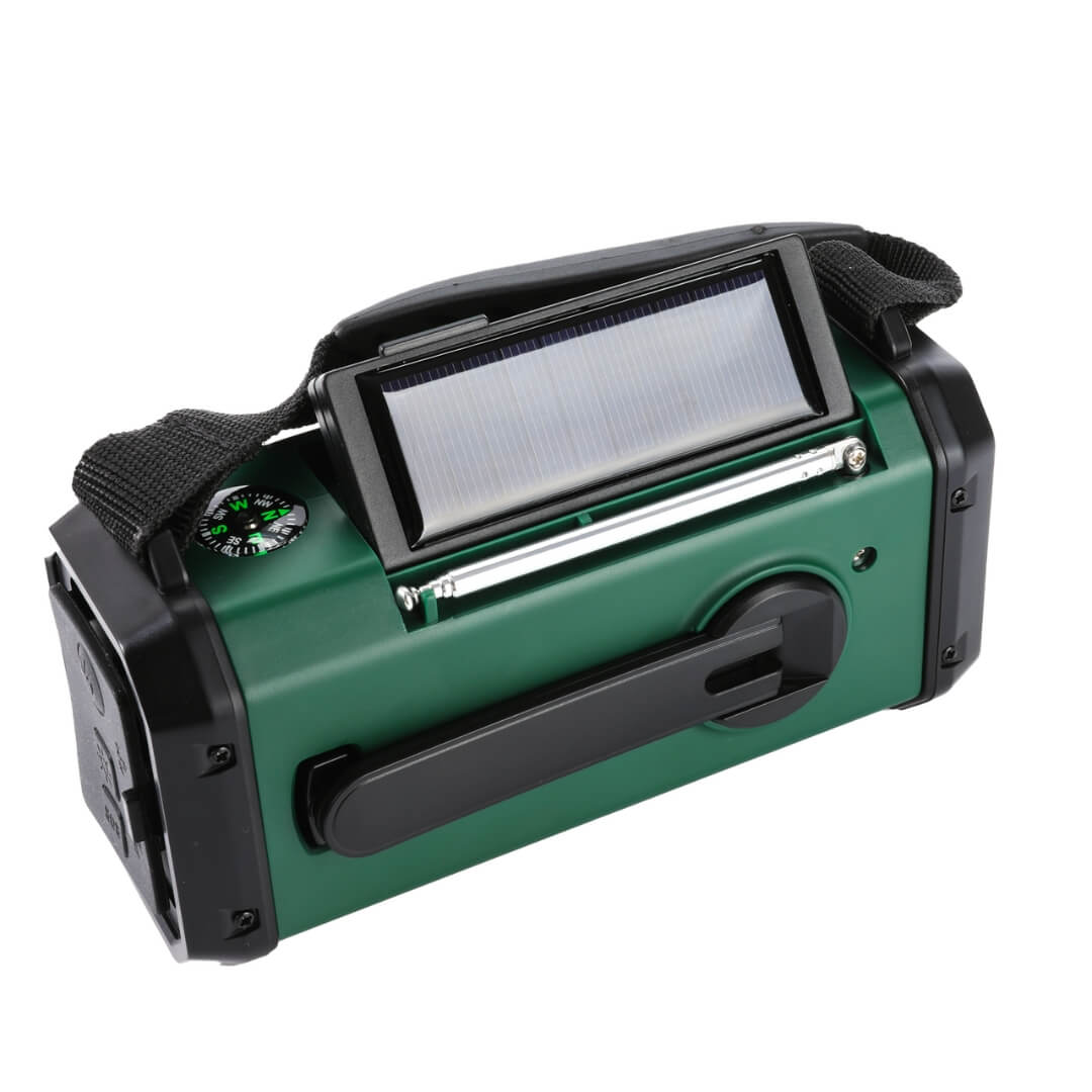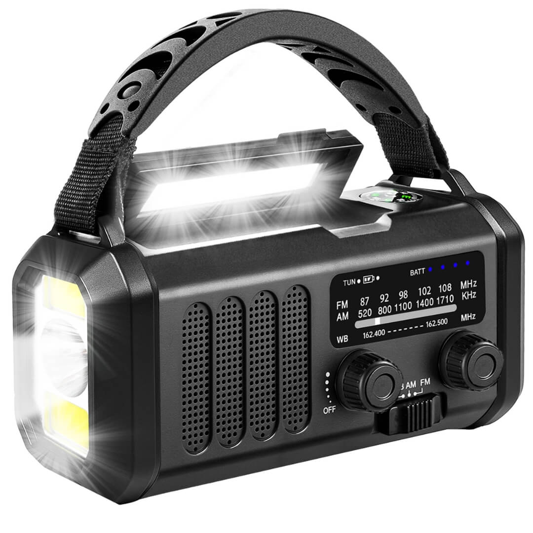 Nødradio på 20.000 mAh sikrer dig i flere situationer om du er i naturen eller i tilfælde af en krise. Nødradioen har dimensionerne 16,5 x 9 x 7 cm. Den har indbygget AM/FM radio samt LED lommelygte, som kan indstilles på flere lysniveauer, samt et læselys på bagsiden. Nødradioen kan oplades med USB-C kabel, der også er inkluderet. Derudover kan den oplade telefon via USB-A.