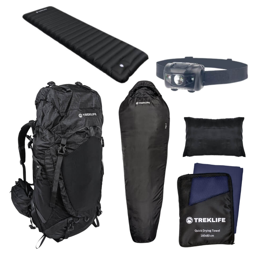 Pakken indeholder også en pandelampe så du kan navigere om aftenen og natten og som kan bruges til at give lys i shelteret eller teltet. Sidst, men ikke mindst, indeholder pakken en valgfri vandrerygsæk. Skal du sove i telt på turen, kan du desuden tilkøbe et telt til pakken.