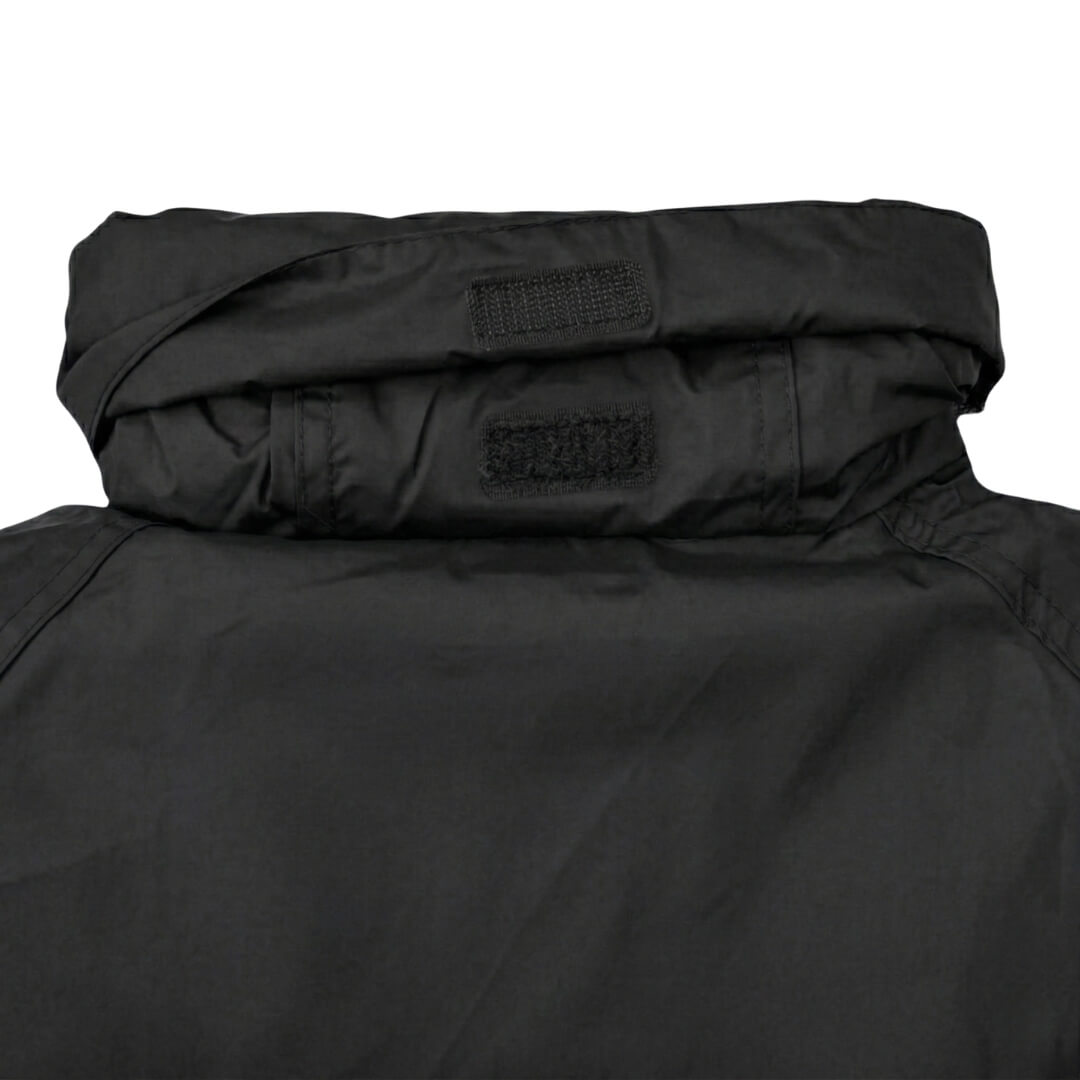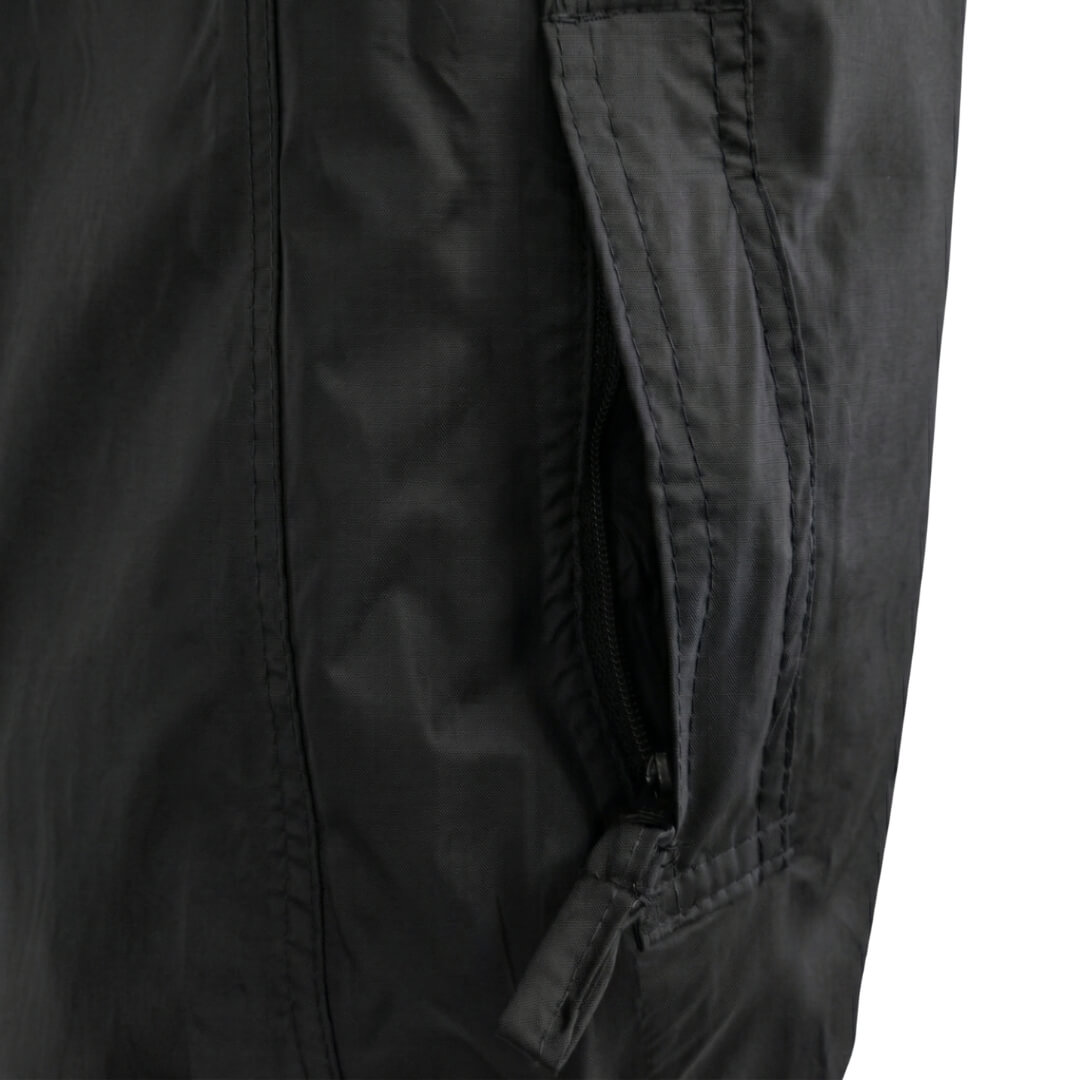 Jakken har en sammenfoldelig hætte, 2 lynlåslommer og kan justeres i bunden for at lukke tæt. Bukserne har en elastisk talje og kan justeres med velcro i bunden. Desuden har bukserne 2 åbne lommeindgange.