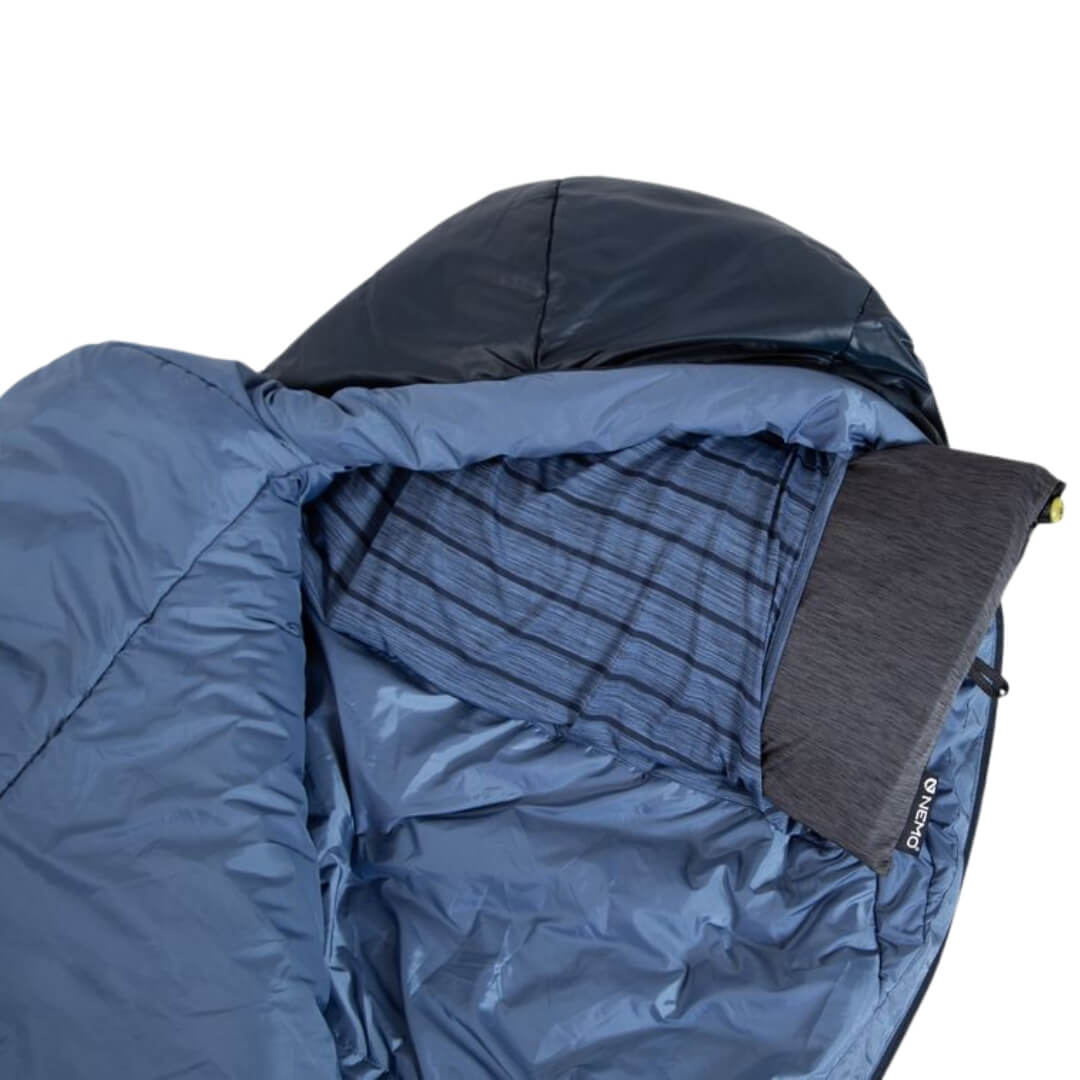 Nemo’s tempo-serie er kendt for sin Classic Spoon™-form. Formen giver ekstra plads ved albuer og knæ, hvilket gør det nemmere at bevæge sig i soveposen, og giver mulighed for mere naturlige sovestillinger. Det indvendige materiale er blødt og behageligt mod huden, hvilket er med til at øge komforten. Derudover har soveposen indbygget plads til pude, der også medvirker til øget komfort.