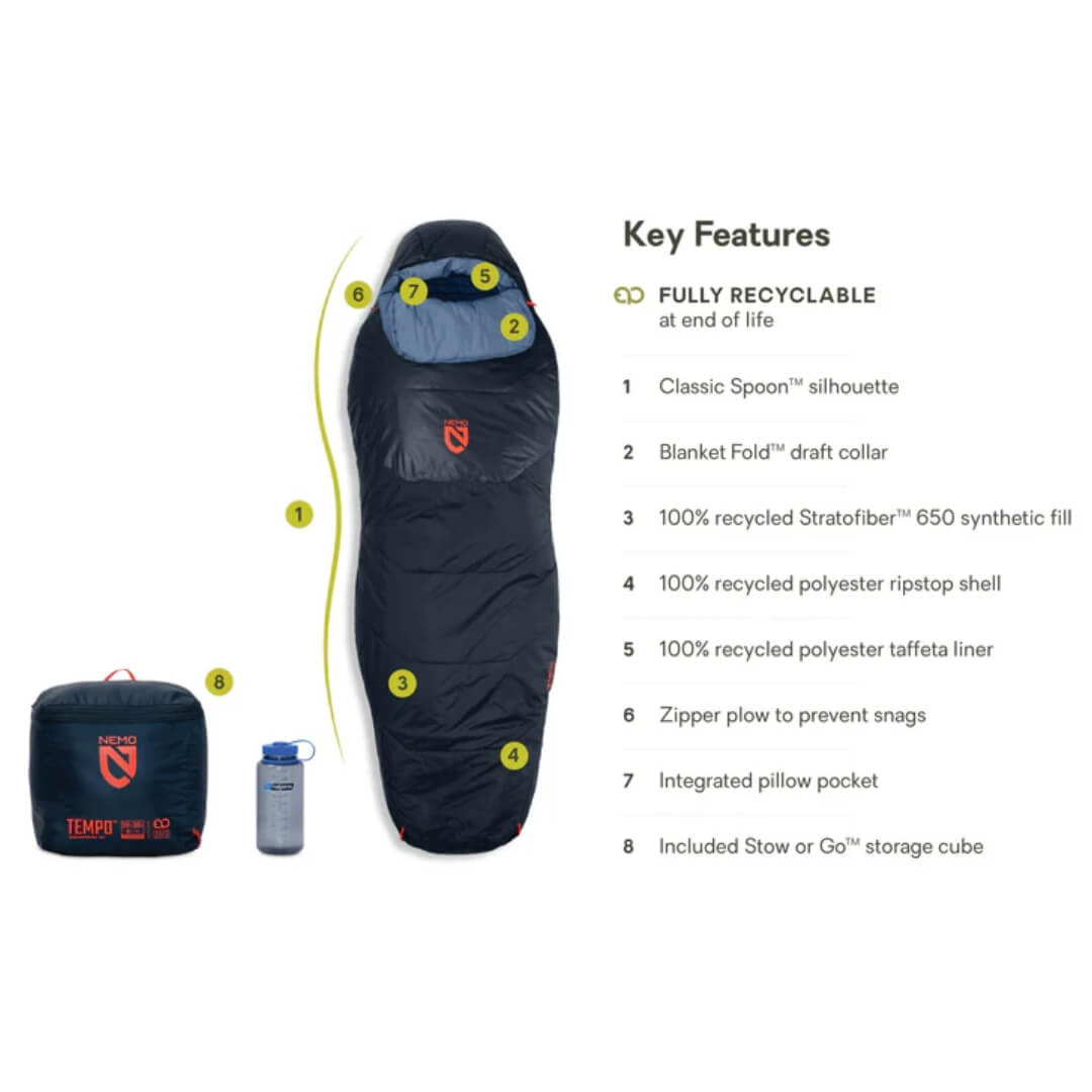 Nemo Tempo Mens 20 Endless Promise er en komfortabel og rummelig sovepose til brug i 3 sæsoner. Den egner sig godt til både camping, vandreture og backpacking, hvor man har brug for en sovepose, der kan holde en varm på kølige nætter.