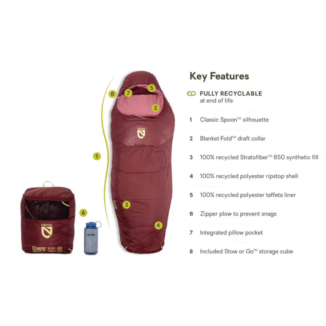 Tempo-serien er designet med Nemos Classic Spoon® form. Formen giver ekstra plads omkring skulder og knæ og er helt perfekt til dig der foretrækker at sove på siden. Formen gør det generelt lettere at skifte soveposition og giver en mindre indelukket følelse sammenlignet med mere tætsiddende soveposer. Trods Classic Spoon formen er modellen relativ kompakt og stadig nem at have med i oppakningen.