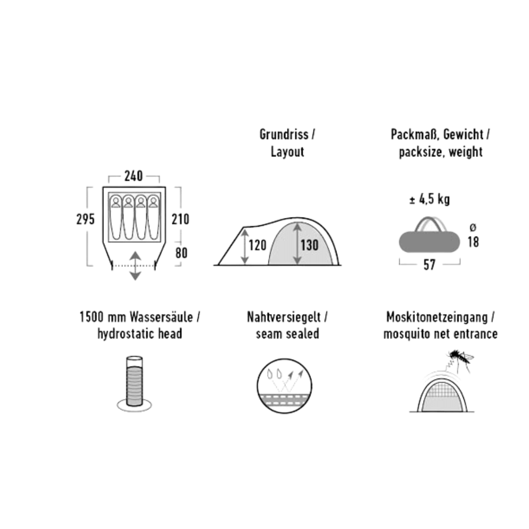 Narvik 4 fra High Peak er et rummeligt og praktisk telt til camping, festivaler og weekendture. Teltet er lavet til at beskytte mod vind og vejr, da det er udstyret med en PFC-fri vandafvisende behandling og tapede sømme.